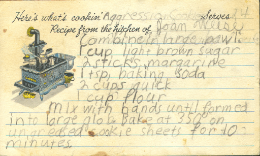 When we moved into the motorhome for our life on the road I copied my favorite recipes and have them on my computer. Sometimes I just took a picture to capture the “memory” of the recipe. Here’s one of my favorites that daughter Laura brought into the family when she was in Kindergarten! Aggression Cookies:
