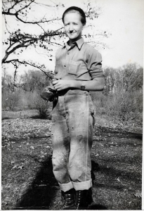 At age 12, in 1932, Anne was sent out in the world to be a maid/nanny to wealthy families and to send her meager wages home to help support her family. She managed to finish 3 years of high school then married my dad at age 18. In this picture I think Mom is holding a soft leather helmet that she wore when they went cycling. I’m amazed to see she is wearing a watch and has a pack of cigarettes in her pocket. I think she was always a “feisty broad”.